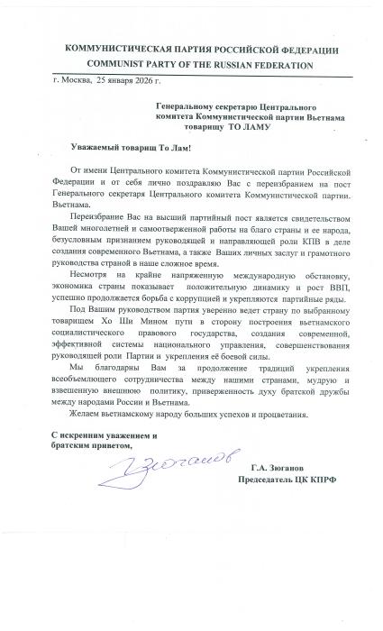 Поздравление Председателя ЦК КПРФ Г.А. Зюганова Генеральному секретарю ЦК Компартии Вьетнама товарищу То Ламу.